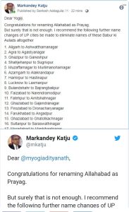पूर्व जस्टिस काटजू ने फेसबुक पर अपनी पोस्ट में लिखा,”प्रयाग के रूप में इलाहाबाद का पुनर्नामकरण करने के लिए बधाई। लेकिन निश्चित रूप से यह पर्याप्त नहीं है। मेरा सुझाव है कि इन बाबर की औलादों के नाम को खत्म करने के लिए यूपी शहरों के आगे के नाम परिवर्तन किए जाएं। इस प्रकार की दयालुता के लिए याचक के लिए प्रार्थना है।”