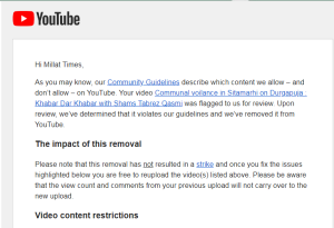 वीडियो हटाने के संबंध में यूट्यूब का मेल