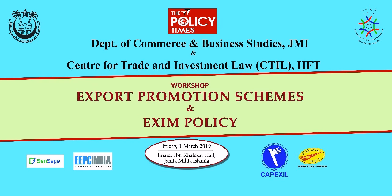 The Policy Times in partnership with Centre for International Trade and Investment Law (CTIL-IIFT), Department of Commerce and Business Studies, Jamia Millia Islamia (JMI), Engineering Export Promotion Council (EEPC India), and Chemicals and Allied Products Export Promotion Council (CAPEXIL) is organizing a one day workshop on “Export Promotion Schemes & EXIM Policy” between 0930 hrs – 1750 hrs on Friday, 1 March, 2019 in New Delhi.