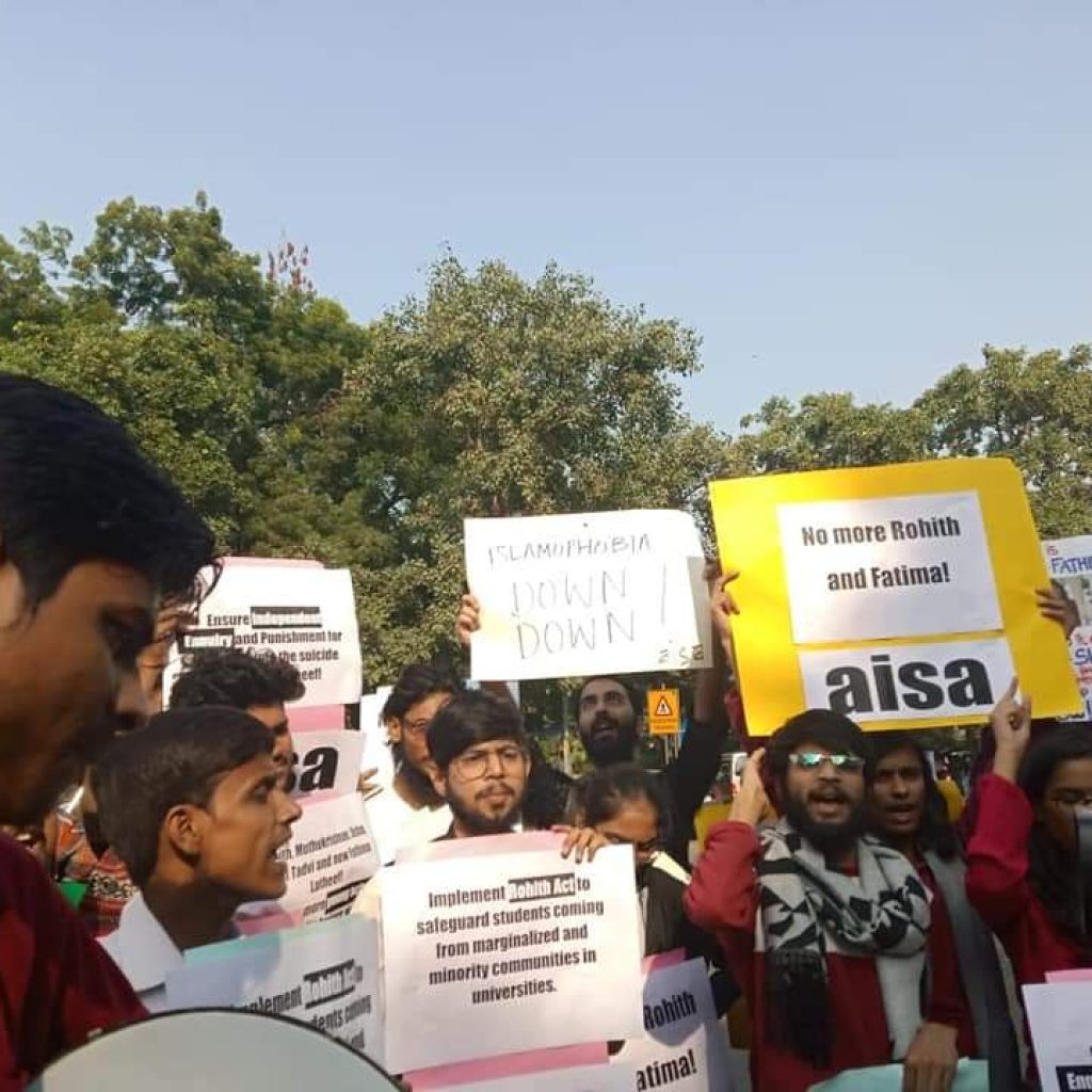 AISA protested outside MHRD to demanding probe into the suicide of Fathima Latheef who was a student of IIT Madras.