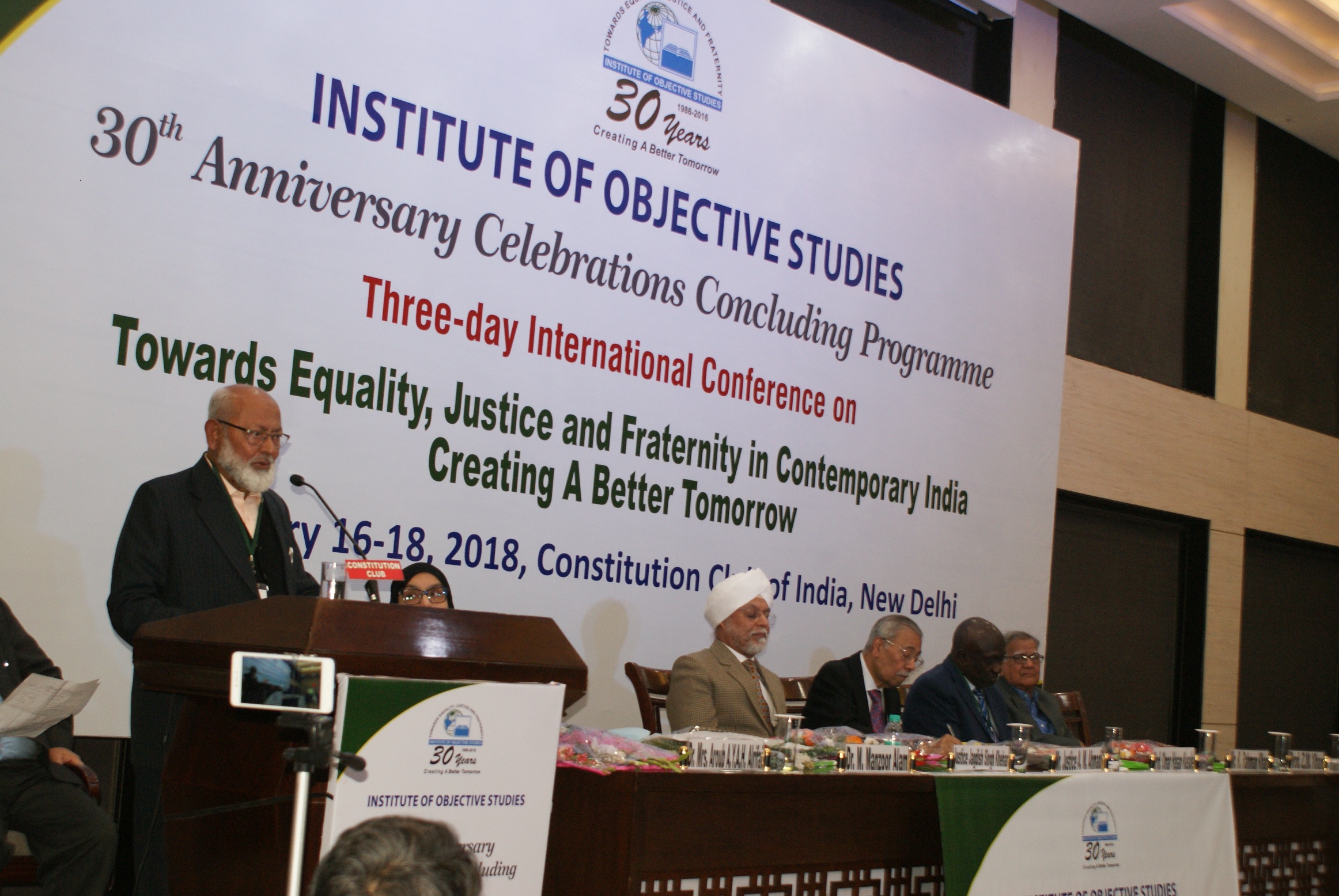 इंस्टिट्यूट ऑफ ऑब्जेक्टिव स्टडीज के अंतर्गत आज दिल्ली इस्थित कांस्टीट्यूशन क्लब ऑफ इंडिया में शानदार अधिवेशन शुरू हुआ, तीन दिवसीय इस प्रोग्राम में राष्ट्रीय व अंतराष्ट्रीय के प्रख्यात लेखक, विचारक और शोधकर्ता शामिल हो रहे हैं। आज के उद्घाटन समारोह में मुख्य अतिथि पूर्व चीफ जस्टिस ऑफ इंडिया जगदीश सिंह खेहर ने कहा कि मानव एक जैसे नही होते उनमें अलग अलग कार्य करने की छमता होती है। उनमे से कुछ लोग एक दूसरे से बेहतर दिखते हैं, तो कुछ लोग ज्ञानी और बुद्धिमान होते हैं, और यही लोग आगे चल कर बुद्धिजीवी बनकर समाज में समांतर लाने की कोशिश करते हैं। खेहर ने आगे कहा कि आजादी के 70 साल बाद भी हम पिछड़ों को रिजर्वेसन देने से महरूम रहे हैं, 1789 में फ्रांसीसी इंकलाब की बुनियाद भी आजादी और एक दूसरे में बराबरी और भाईचारगी थी क्योंकि यह मजलूमों की बुनियाद थी जिन्हें सताया गया था और गैर बराबरी की समाजी हालात को बयां करता है उन्होंने कहा कि आजादी के बगेर बराबरी और भाईचारे के बारे में सोचना बेमानी हैं। उन्होंने कहा के भाईचारा आज़ादी और बराबरी उस वक़्त तक मोकम्मल नही है जब तक आपस में एक दूसरे से संबंध न हो। आर्टिकल 14,15, 16 का संबंध भी बराबरी इंसाफ और भाईचारे से है, एक जज के तौर पे मैंने खुद इसका अध्ययन किया है और ये पाया के इंसान पैदायशी तौर पे बराबर नही है, बराबरी के लिए उसे जद्दोजहद करनी पड़ती है। इस मौके पर IOS के चेयरमैन डॉ मोहम्मद मंजूर आलम ने IOS का परिचय कराते हुए कहा कि IOS अपने 30 वर्षों के कार्यकाल में बुनियादी मुद्दों पर हमेशा परिचर्चा करता रहा, मगर इस बार हमने बराबरी, भाईचारगी और इंसाफ के विषय को चुना ताकि ये अंदाज़ा लगा सके की हिंदुस्तान में मुसलमान इसाई दलित पिछड़े वर्ग आज कहां खड़ा है। हिंदुस्तान की संविधान के रौशनी में देखा जाये तो उन सबकी हालत अच्छी नहीं है, और संविधान ने उन्हें जो हक दिया है तो वो उन्हें हासिल नही है।