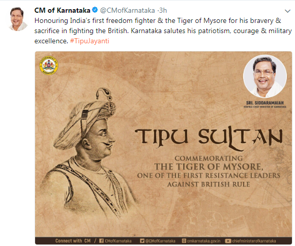 The Congress government in Karnataka is celebrating Tipu Jayanti on Friday amid tight security. The Siddaramaiah-led government in Karnataka has been celebrating the birth anniversary of the 18th century Mysore ruler for the past three years to honour him as a freedom fighter. Tipu Sultan died fighting the British. Right-wing Hindu groups are, however, opposed to the celebrations as they see Tipu Sultan as a barabaric ruler who carried out forceful conversions.