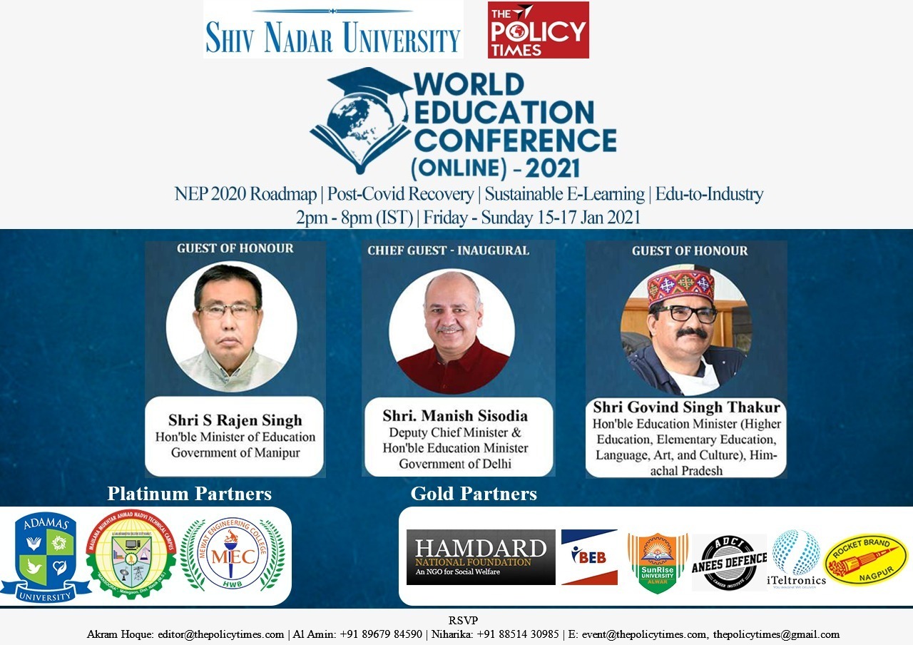 To deliberate on such issues, The Policy Times and Shiv Nadar University are jointly organizing a 3-Days virtual conference – the World Education Conference (WEC2021 online) between Friday, 15 January 2021and Sunday, 17 January 2021 from 2pm-8pm(IST) on Zoom. WEC2021 aims to bring the world’s educators ona single platform and discuss a new direction to education in 2021. The Conference will feature discussionson the Post-Covid recovery roadmap of education losses occurred in 2020, NEP 2020 implementation roadmap, Sustainable E-learning, and most importantly, education-industry integration.